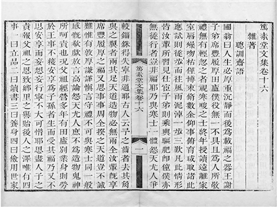 清康熙年间刊本《笃素堂文集》书影。《笃素堂文集》是张英的文集,这一页展示的是其家训著作《聪训斋语》。 资料图片