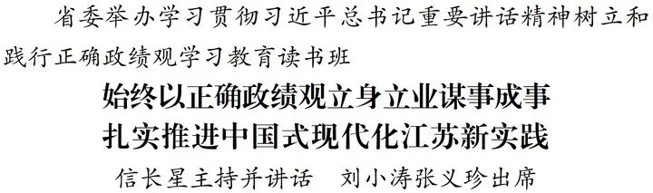3月23日至25日,省委举办学习贯彻习近平总书记重要讲话精神、树立和践行正确政绩观学习教育读书班。省委书记信长星在开班式上讲话并主持集中交流。他强调,要深入学习贯彻习近平总书记参加今年全国人代会江苏代表团审议时的重要讲话精神、关于树立和践行正确政绩观的重要论述,用心读原著、学原文、悟原理,深刻领悟“两个确立”的决定性意义、坚决做到“两个维护”,深刻理解把握“经济大省要在研究新情况、解决新问题上下功夫、出经验”的重大意义和实践要求,进一步增强树立和践行正确政绩观的思想自觉和行动自觉,扎扎实实做好“十五五”开局之年各项工作,推动中国式现代化江苏新实践不断取得新进展新成效。省长刘小涛、省政协主席张义珍出席。